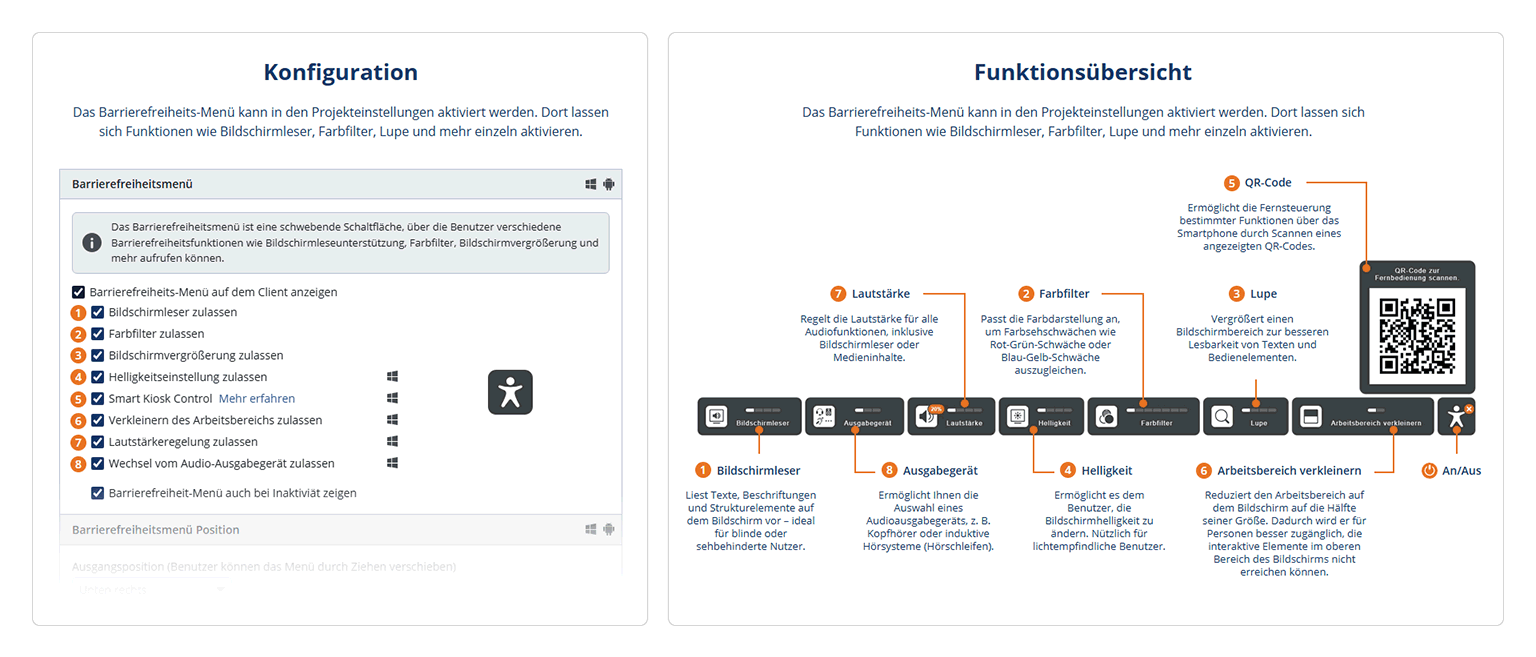 Kiosk-Terminals sind oft öffentliche Kontaktpunkte – im Bürgerbüro, in der Personalabteilung, im Museum oder im Einzelhandel. Eine zugängliche Bedienoberfläche ist daher nicht nur rechtlich relevant, sondern erweitert die angesprochene Zielgruppe und steigert die Nutzerfreundlichkeit. SiteKiosk Online bietet ein eigenes, integriertes Barrierefreiheitsmenü mit auf Kiosk Anwendungen maßgeschneiderten SiteKiosk Screenreader, Bildschirmvergrößerung, Farbanpassung, Helligkeits- und Lautstärkeregelung.