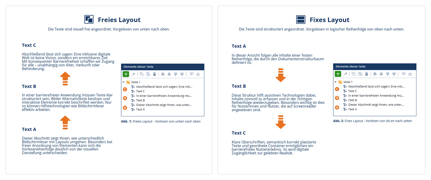 Bei fixen Layouts erfolgt das Vorlesen und Navigieren im Treeview von oben nach unten. Das bedeutet: Elemente, die zuerst fokussiert oder vorgelesen werden sollen, müssen im Treeview weiter oben stehen.
