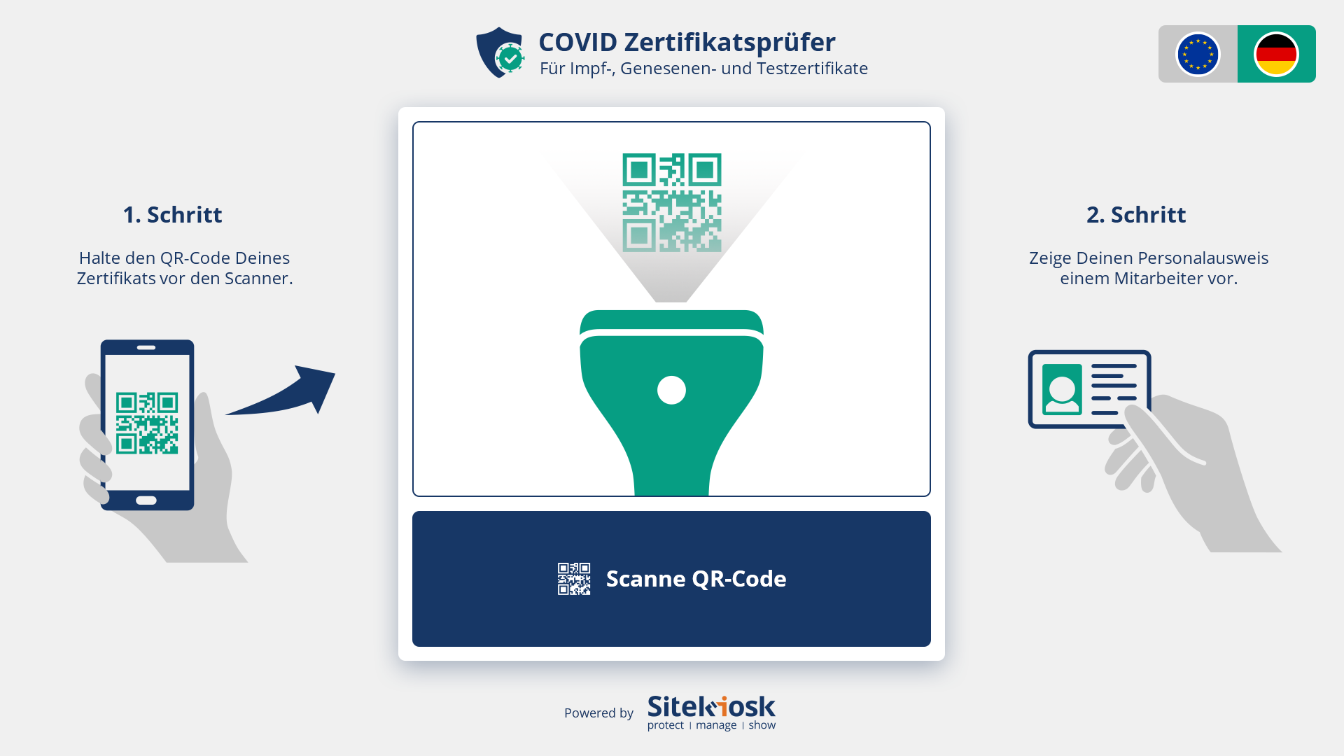 Für die Überprüfung des Zertifikats benötigen Sie am Eingang vor Ort entweder ein Android-Tablet oder einen Windows-PC mit Kamera oder QR-Code-Scanner zum Einlesen des im Zertifikat angegebenen QR-Codes sowie Bildschirme, auf denen die Statusinformation für Ihre Besucher angezeigt werden.