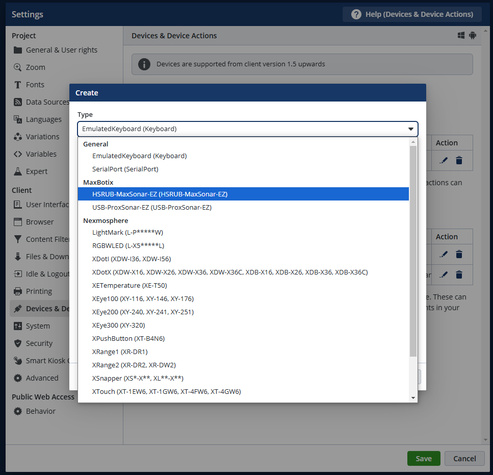 The present example describes the integration of the HSRUB-MaxSonar-EZ proximity sensor into a kiosk project. The distance sensor used is one of many different devices and sensors that can be integrated into SiteKiosk Online projects.