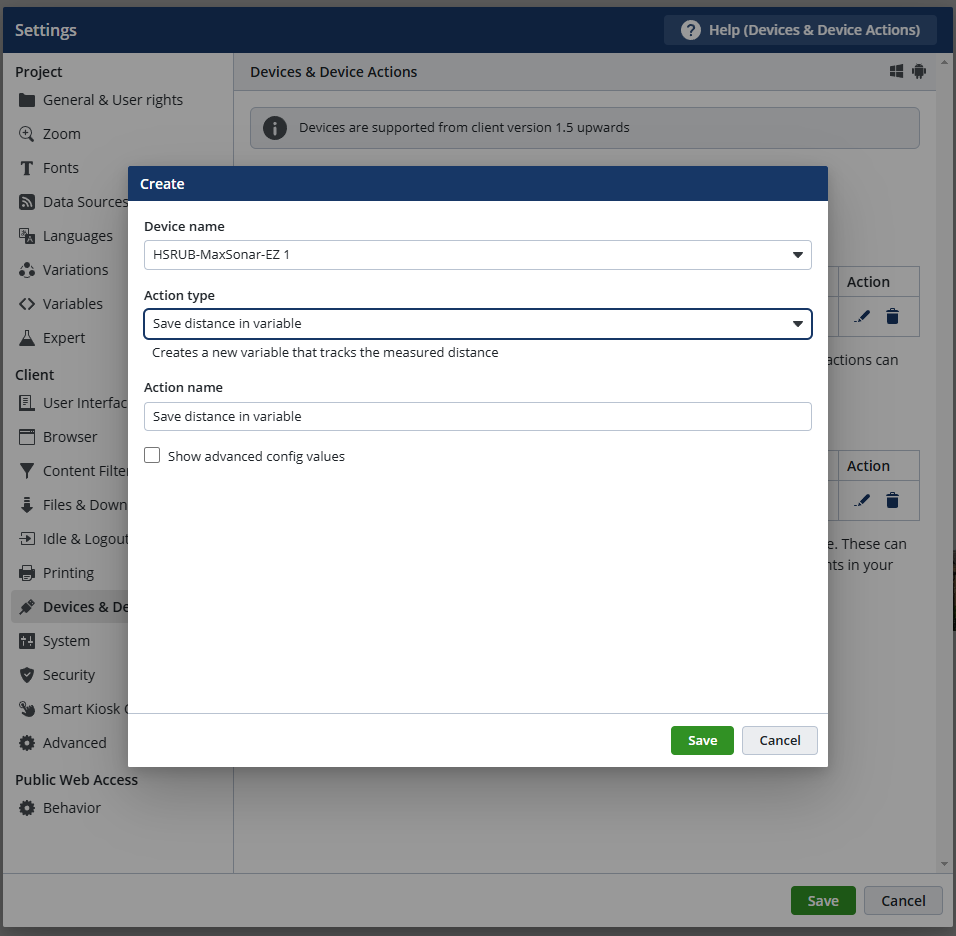 Next, the device action must be defined to trigger a specific action in the project. The distance sensor can trigger two different actions: