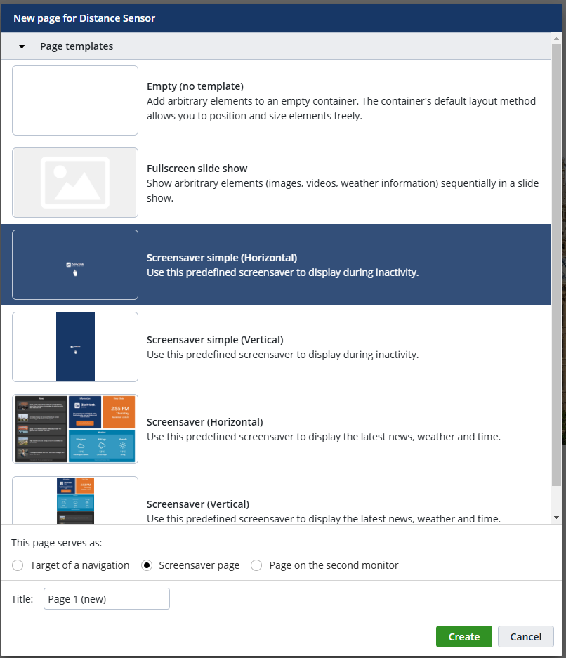 - In this example, the template “Screensaver simple (Horizontal)” was selected. Make sure that in the selection row “This page serves as:” the option “Screensaver page” is selected. Elements can also be used as screensavers; for this, the display condition must be manually adjusted on the desired element (Screensaver (User inactive)).