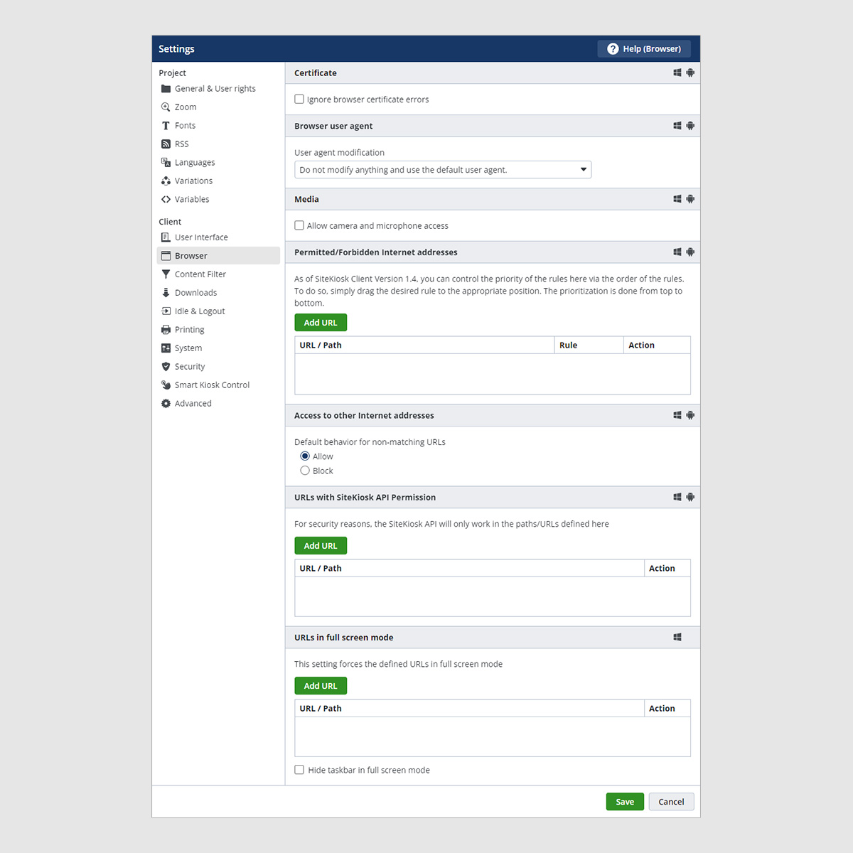 SiteKiosk Online provides reliable protection for your unsupervised digital signage displays, tablets, and interactive/self-service terminals. Prevent access to the operating system, restrict web content on Windows and Android devices, and ensures fail-safe operation. You can make essential adjustments effortlessly using the built-in online configuration tool, with no programming skills required.