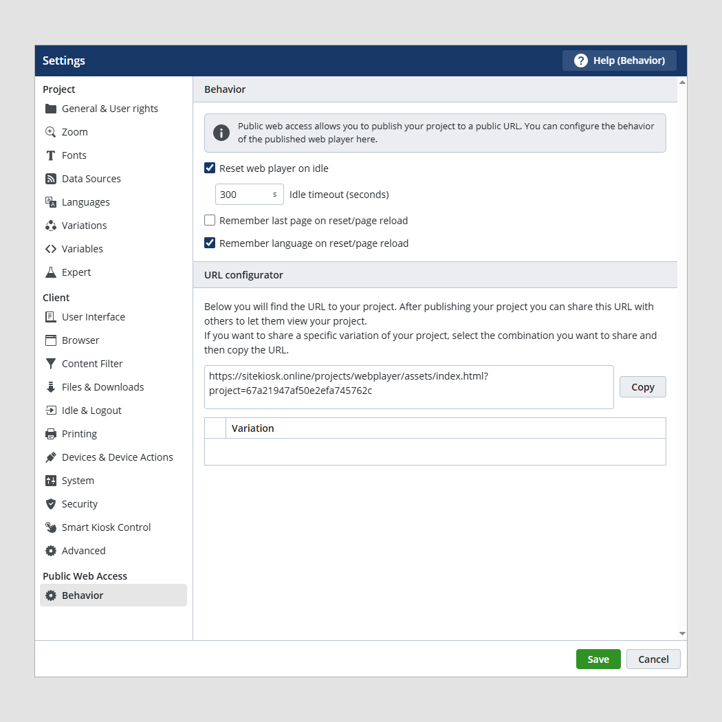 Public web access allows you to publish your projects to a public URL. You can configure the behavior of the published web player.